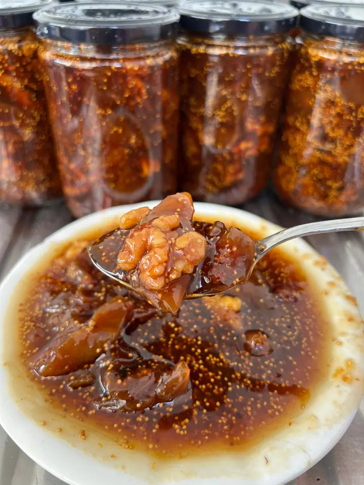 Feine Feigenkonfitüre mit knackigen Walnüssen – eine süße, natürliche Kombination. Ideal als Brotaufstrich oder als besonderer Nachtisch. Reich an Ballaststoffen und natürlichen Aromen.