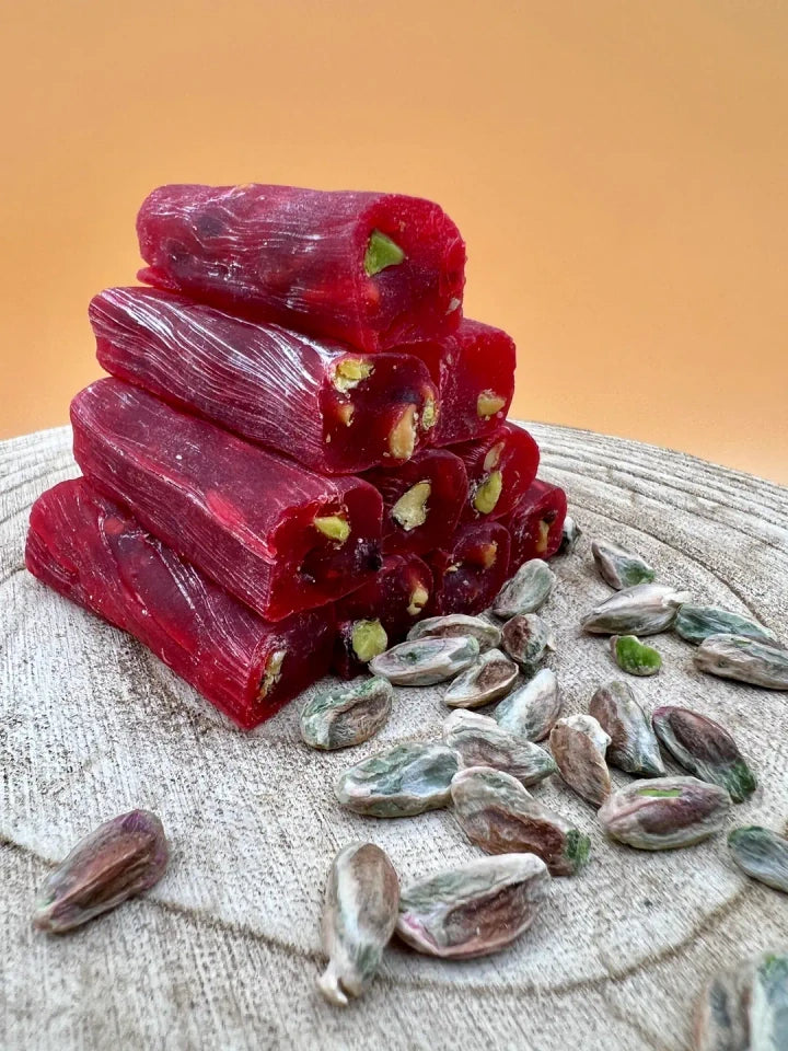 Zartes Turkish Delight in praktischer Fingerform, verfeinert mit fruchtigem Granatapfelaroma und edlen Antep-Pistazien. Eine harmonische Kombination aus Süße, Frische und feiner Nuss – traditionell hergestellt und liebevoll verpackt.